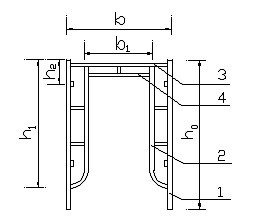 1--立桿;2--立桿加強桿;3--橫桿;4--橫桿加強桿 計算門架的幾何尺寸圖腳手架搭設高度為3.2米,門架型號采用MF1219,鋼材為Q235。扣件連接方式:單扣件;搭設尺寸為:門架的寬度 b = 0.8米,門架的高度 h0 = 1.60米,步距1.90米,跨距 l = 1.8米。門架 h1 = 1.536米,h2 = 0.100米,b1 = 0.750米。門架立桿采用 Φ48.0×3.5 mm鋼管,立桿加強桿采用 Φ26.8×2.5 mm鋼管,腳手架搭設高度3.2m。